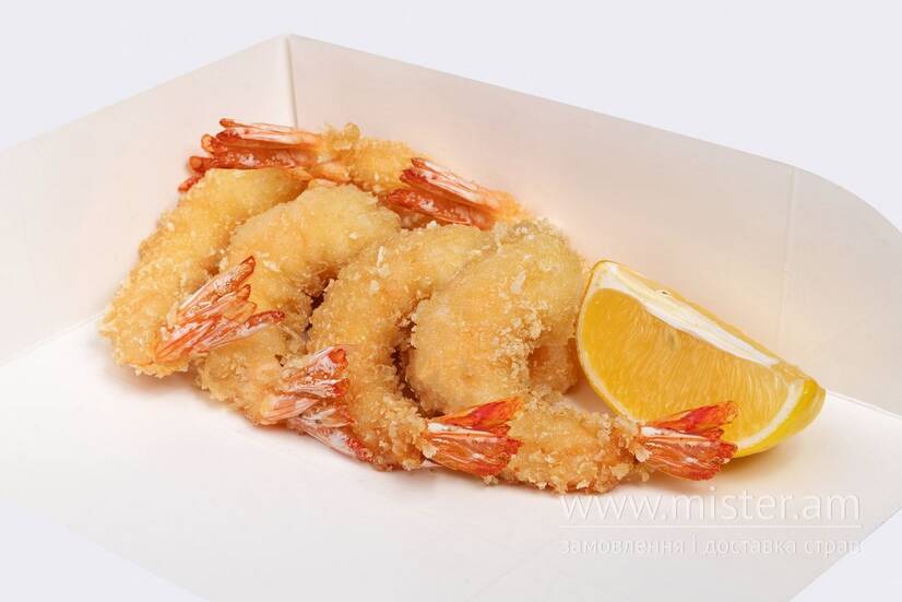 Королівська креветка, темпура, сухарі Панко, лимон.