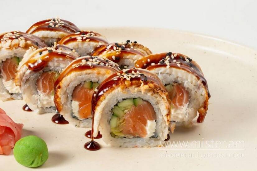 Норі, рис, крем-сир, лосось, іка тобіко, авокадо, огірок, айсберг, вугор, соус унагі, кунжут мікс.