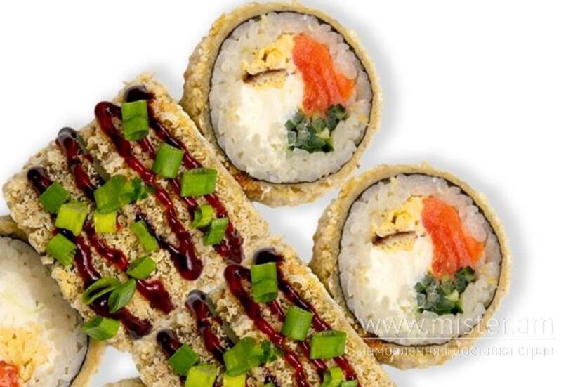 Норі, рис, крем-сир, лосось, японський омлет, тісто темпура, панко, соус унагі, цибуля зелена.