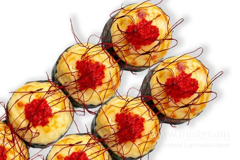 Норі, рис, кунжут, крем-сир, креветка, японський омлет, сирний мікс, ікра тобіко, соус світ чілі, нитки чилі.