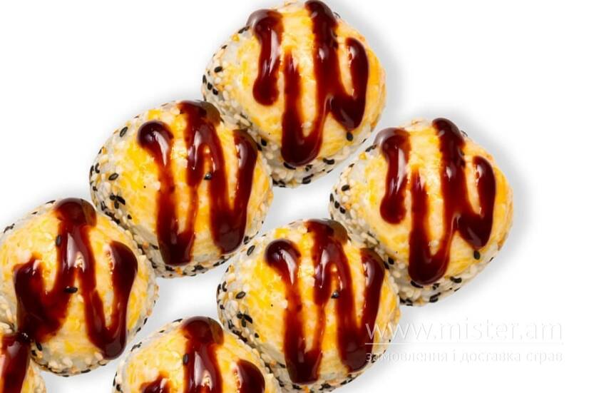 Норі, рис, кунжут мікс, крем-сир, вугор, японський омлет, сирний мікс, соус унагі.