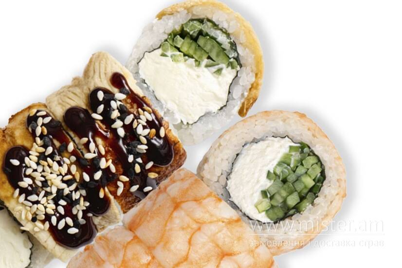 Норі, рис, крем-сир, креветка, вугор, огірок, соус унагі, кунжут мікс.