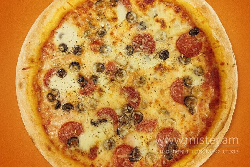 Італійське борошно, соус томатний, моцарела, шинка, маслини, салямі, моцарела кульками, пармезан, орегано.