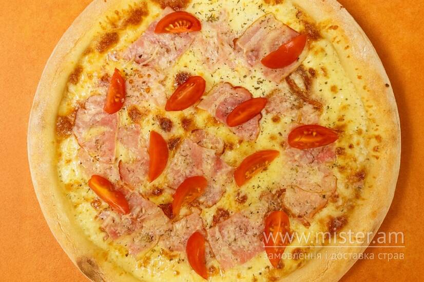 Італійське борошно, вершки, моцарела, смажений бекон, шинка, томати чері, пармезан, орегано.