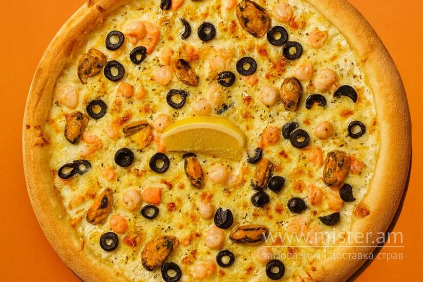 Італійське борошно, вершки, моцарела, тигрова креветка, слабосолоний лосось, мідія, маслини, лимон, орегано.