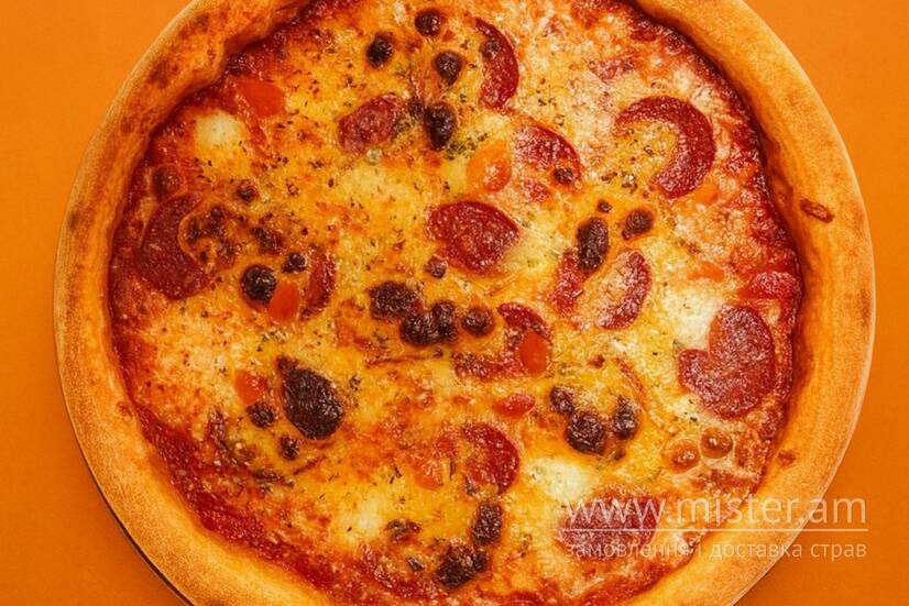 Італійське борошно, соус томатний, моцарела, салямі, солодкий перець, моцарела кульками, чедер, пармезан, орегано.