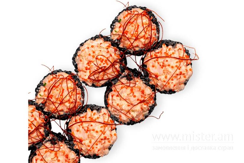 Норі, рис, крем сир, айсберг, японський омлет, креветка, майонез, шрірача, ікра тобіко, нитки чилі.