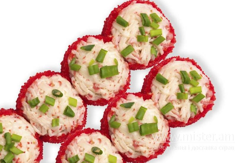 Норі, рис, крем-сир, огірок, ікра тобіко, краб, японський майонез, цибуля зелена.