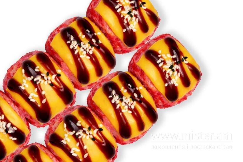 Норі, рис, крем-сир, ікра тобіко, чир чеддер, огірок, кунжут мікс, соус унагі, заміс лосося та креветки.