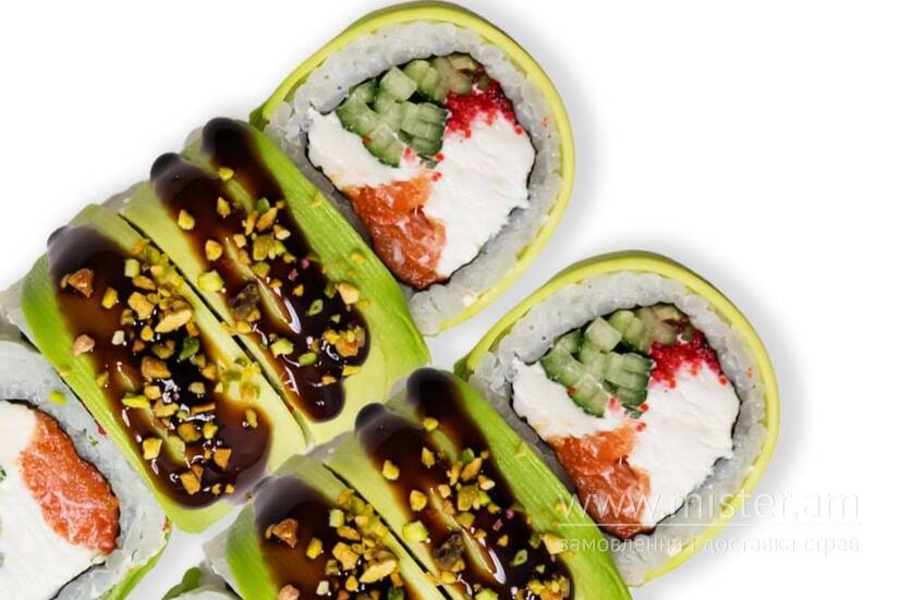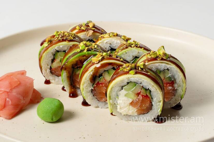 Норі, рис, крем-сир, лосось, ікра тобіко, огірок, авокадо, соус унагі, подрібнена фісташка.