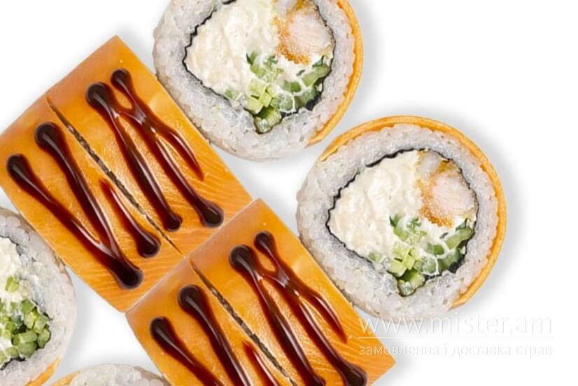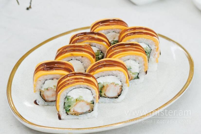 Норі, рис, крем-сир, креветка темпура, огірок, сир чеддер, соус унагі.
