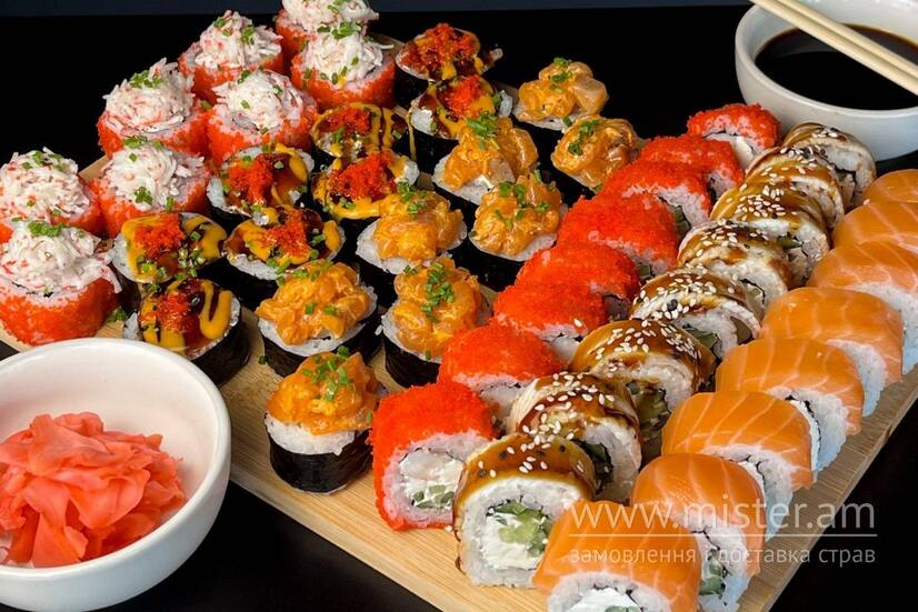 Рол "Philadelphia" лайт, рол "Philadelphia" з вугрем, рол "Philadelphia" в ікрі з креветкою, рол "Вулкан" з ікрою тобіко та спайсі, рол "Kamikaze", Crab roll.