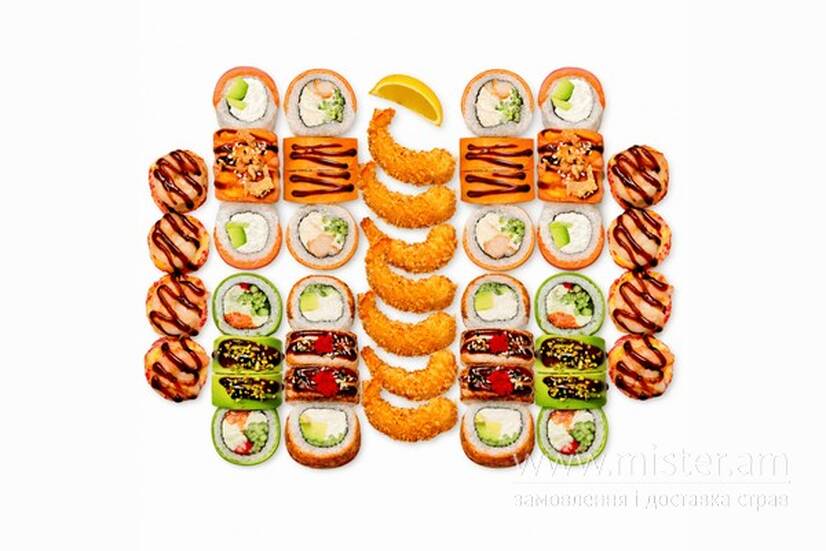 "Гриль рол" з королівською креветкою, рол Queen, рол OMG, рол Нефріт, Сирний з креветкою темпура.