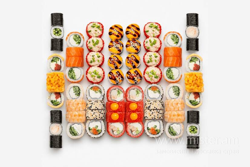 Рол "Philadelphia" лайт, Рол "Philadelphia" з креветкою, Рол "Philadelphia" в ікрі з креветкою, Рол "Philadelphia" в кунжуті з лососем, Макі рол з королівською креветкою, Макі рол з огірком, Запечений рол з лососем та сиром чеддер, Crab roll, Рол Philadelphia Spicy tuna.