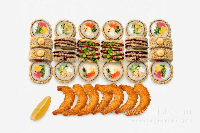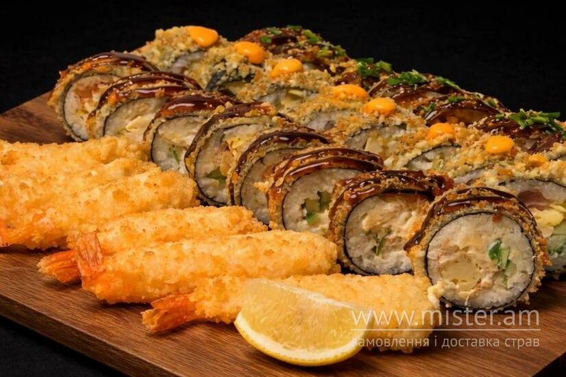 Рол з лососем смажений у фритюрі, рол з тунцем смажений у фритюрі, "Green рол" смажений у фритюрі, Королівська креветка.