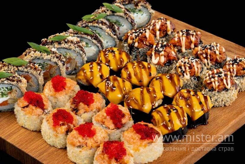 Рол з лососем смажений у фритюрі, рол "Запечена Philadelphia" з ікрою тобіко, рол "Philadelphia" смажена у фритюрі, Запечений рол з лососем та сиром чеддер.