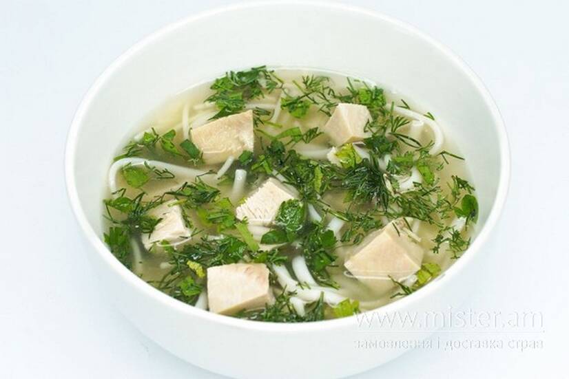 Бульйон курячий, філе куряче, кріп, петрушка, локшина.