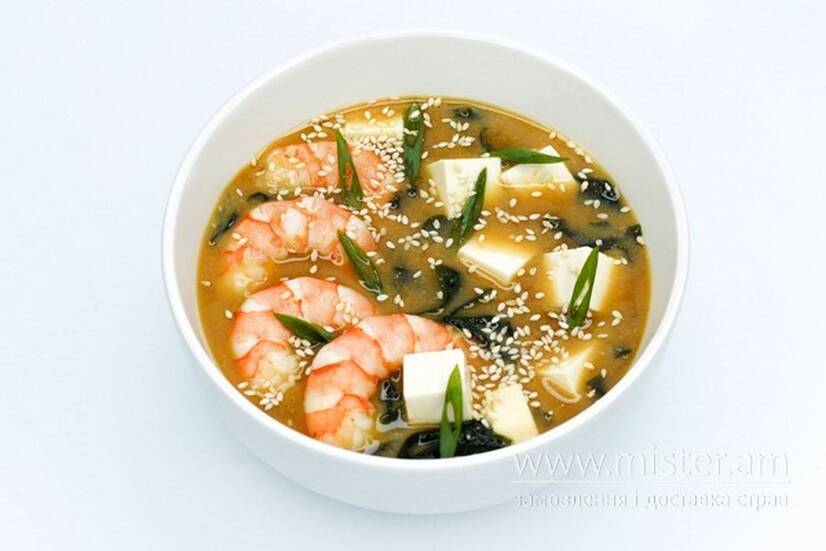 Місо-бульйон, сир тофу, водорості вакаме, королівські креветки, мікс кунжуту, зелена цибуля.