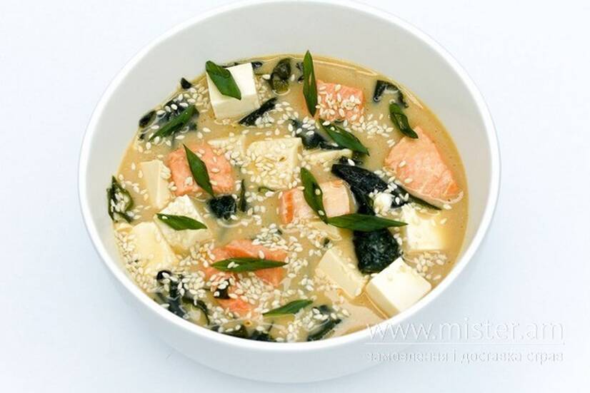 Місо-бульйон, вершки, сир тофу, водорості вакаме, лосось, мікс кунжуту, зелена цибуля.