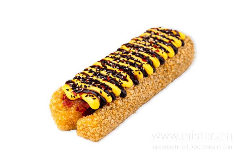 Норі, рис, креветка темпура, огірок, ікра, сир чеддер, крем-сир, панко, темпура, соус унагі, соус сирний, соус солодкий чилі, кунжут чорний.