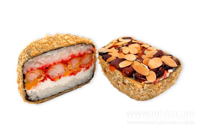 Норі, рис, креветка, крем-сир, манго, ікра тобіко, сухарі панко, тісто темпура, соус унагі, соус манго-чилі, мигдаль.