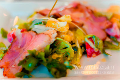 Мікс салатів, соус цезар, черрі, сир пармезан, бекон, куряче філе, перепелині яйця.