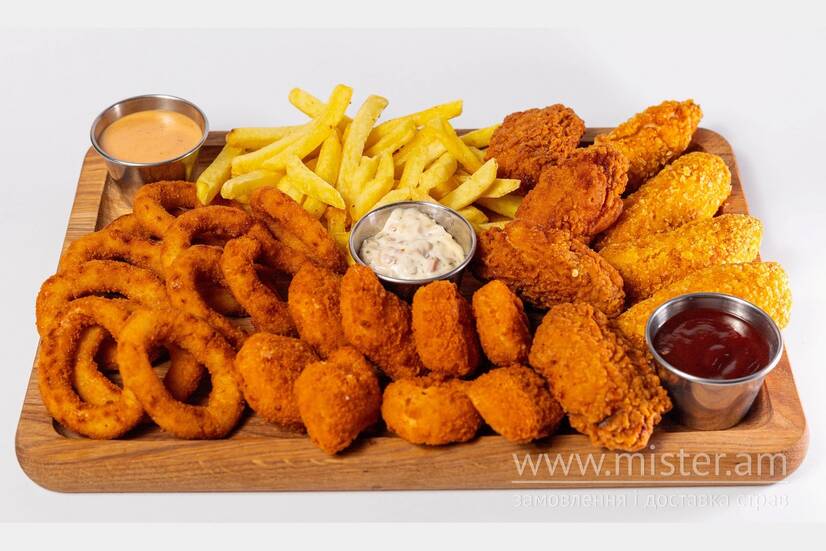 Нагетси курячі, картопля фрі, крило куряче кріспі, цибулеві кільця, курячі стріпси, соуси: бургер, барбекю, тартар.