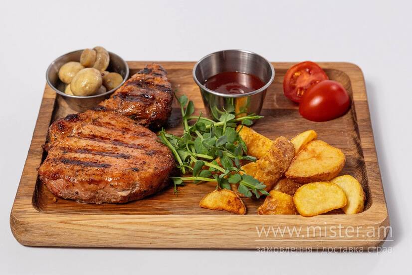 Стейк зі свиної корейки, соус барбекю, картопляні скибки, помідор чері, печериці мариновані, мікрогрін.