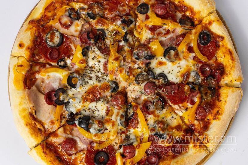 Тісто, соус томатний, сир моцарелла, ковбаки кабаносі, бекон, індичка зі смокера, ковбаса пепероні, перець болгарський, маслини.