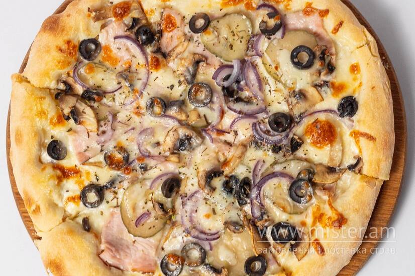Тісто, соус вершковий, сир моцарелла, індичка зі смокера, печериці, цибуля червона, маринований огірок, маслини.