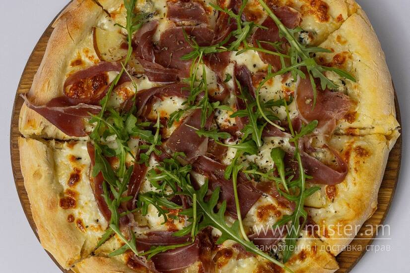 Тісто, соус вершковий, сир моцарелла, прошуто, сир дор блю, груша, рукола.