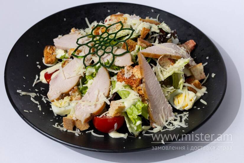 Мікс-салат, помідор чері, перепелині яйця, заправка Кайзер, крутони, індичка зі смокера, сир пармезан.