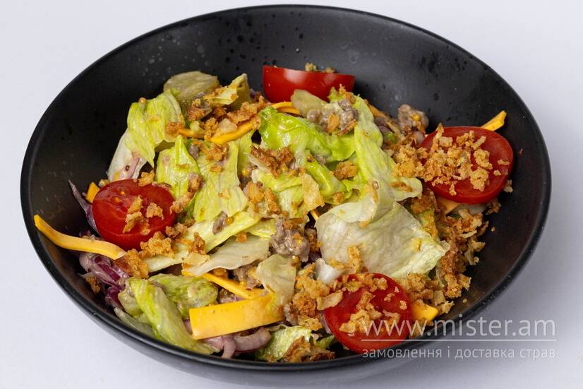 Салат айсберг, яловичина, помідор чері, маринований огірок, сир чеддер, цибуля червона маринована, заправка Біг-Мак.