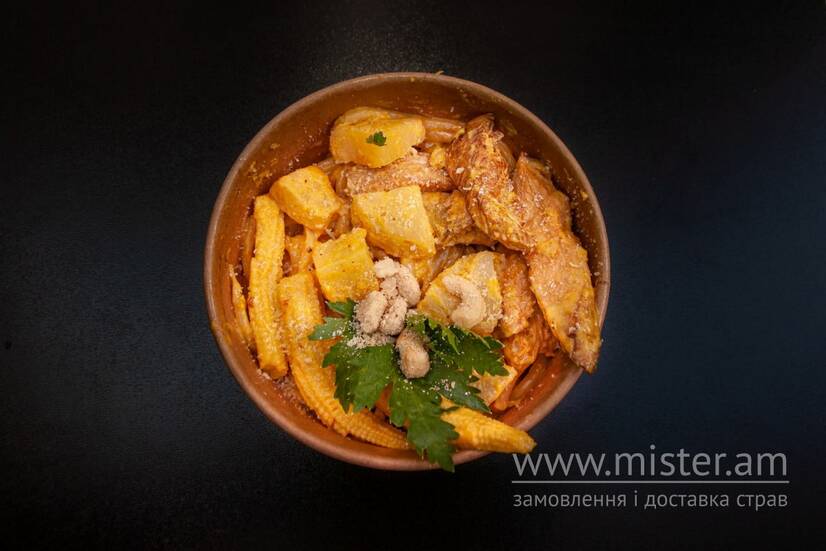 Локшина букатіні, курка, бейбі кукурудза, ананас, вершки, сир чедер, сир пармезан, горіховий мікс.