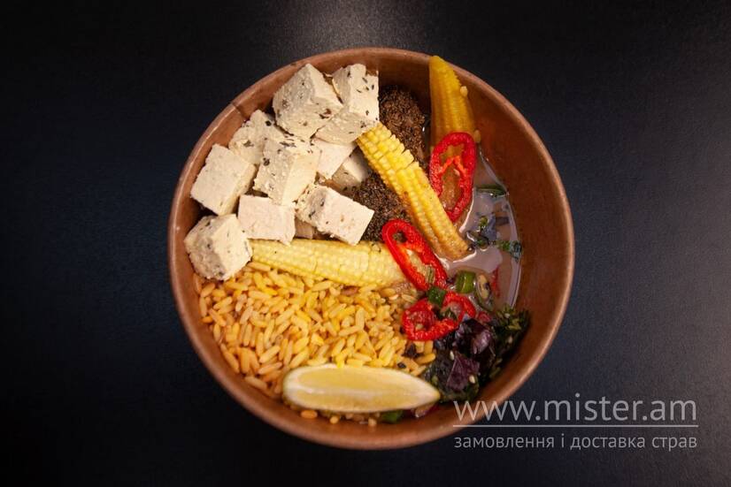Рис, тофу, червона паста Карі, брокколі, бейбі кукурудза, сезонні овочі (перець солодкий, баклажан, цукіні), молоко кокосове, лайм, зелений мікс, кунжут, горіховий мікс.