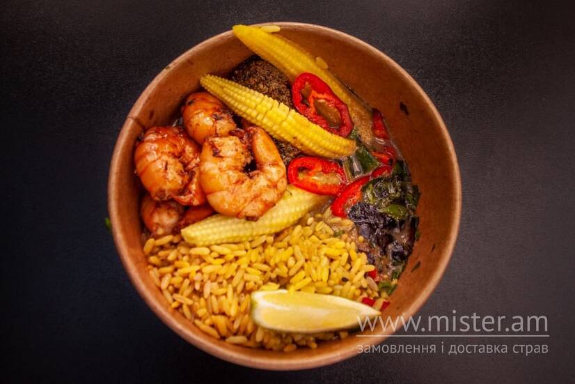 Рис, креветка, зелена паста Карі, брокколі, бейбі кукурудза, сезонні овочі (перець солодкий, баклажан, цукіні), молоко кокосове, лайм, зелений мікс, кунжут, горіховий мікс.