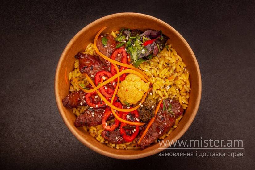 Рис, яловичина, брокколі, цвітна капуста, бейбі кукурудза, морква, цибуля, сезонні овочі (перець солодкий, баклажан, цукіні), соус імбирно-часниковий, зелений мікс, кунжут, горіховий мікс, соус солодкий чилі.