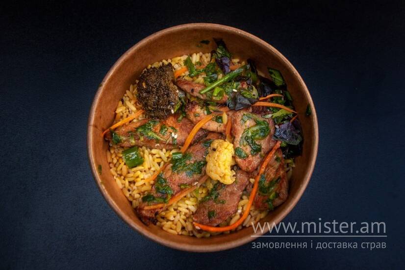 Рис, свинина, брокколі, цвітна капуста, бейбі кукурудза, морква, цибуля, сезонні овочі (перець солодкий, баклажан, цукіні), соус імбирно-часниковий, зелений мікс, кунжут, горіховий мікс, соус черемша.