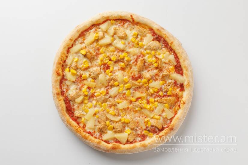Вершкова моцарела, кукурузка, ананас, мариноване філе, смачне тісто, італійський соус пілаті з орегано.