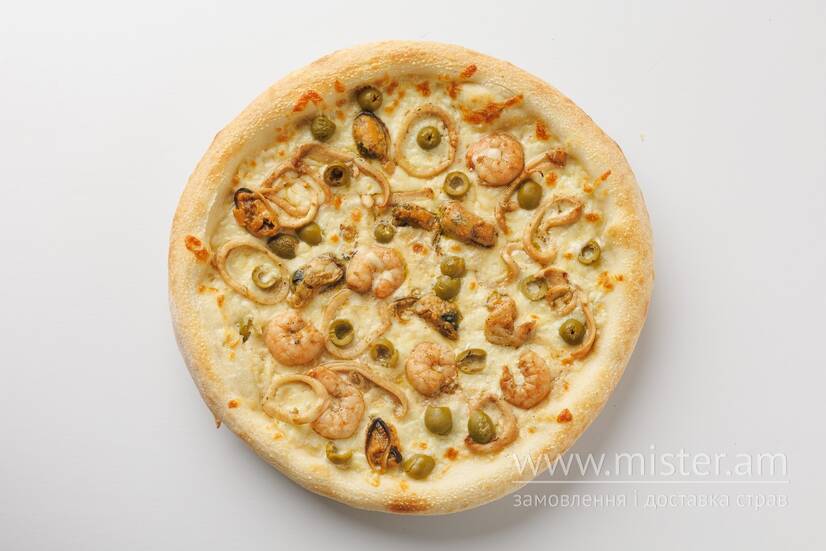 Вершкова моцарела, морські жителі: креветки, мідії, кальмари, пряні оливки, жирні вершки, смачне тісто, італійський соус пілаті з орегано.