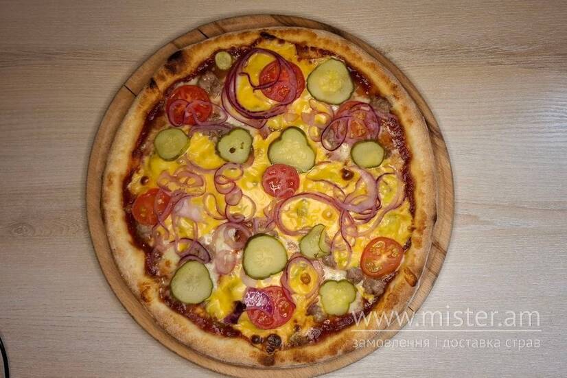 Вершкова моцарела, найсвіжіший фарш з яловичини, солені огірки, цибуля синя маринована, сир чедер, соус барбекю, смачне тісто, італійський соус пілаті з орегано.