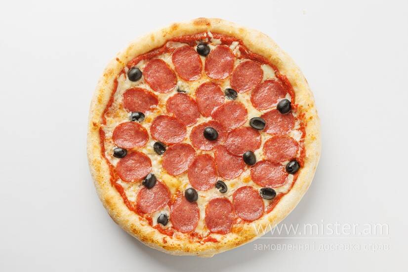 Вершкова моцарела, італійська салямі, пряні маслини, смачне тісто, італійський соус пілаті з орегано.