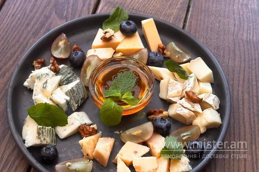 Брі, дорблю, пармезан, гауда з медом та сухофруктами.