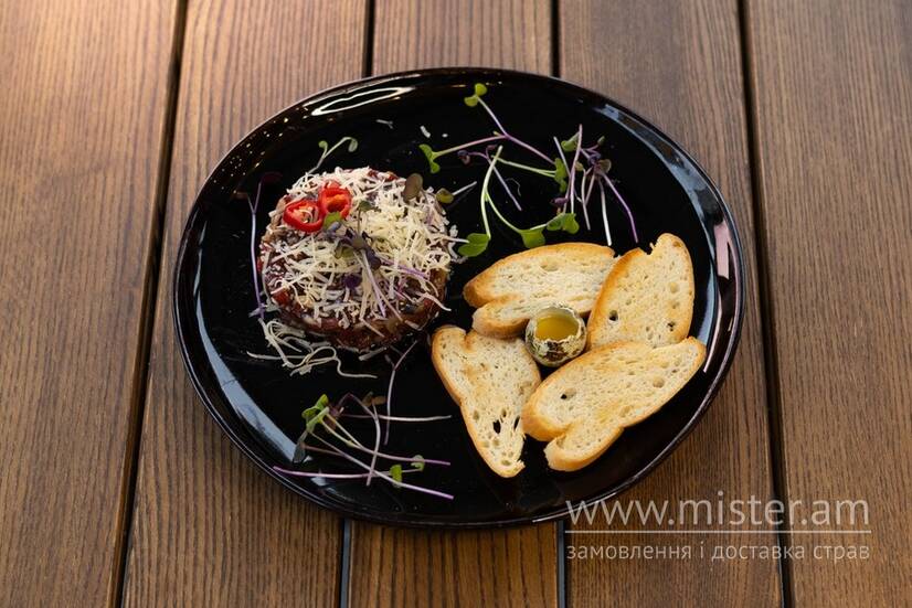 Ніжна маринована телятина, синя цибуля, перепелиний жовток, мариновані огірки, чилі, пармезан, тости з багету.