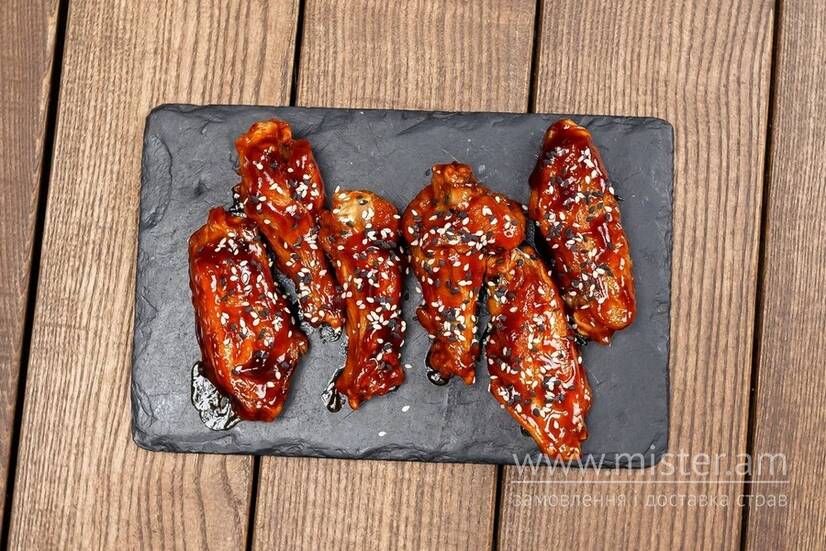 Курячі крильця обсмажені в соусі BBQ з кунжутом.