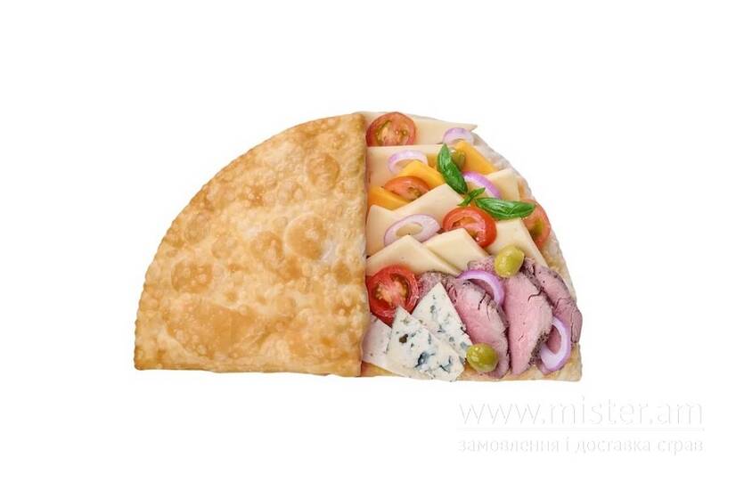 Фарш баранини, кінза, маринована цибуля, оливки, соус кальцоне, мікс 5 сирів.