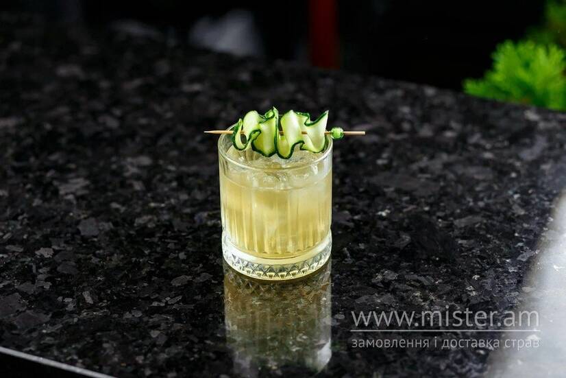 Джин, вермут, сироп бузина, лимонний фреш, сік, лікер.