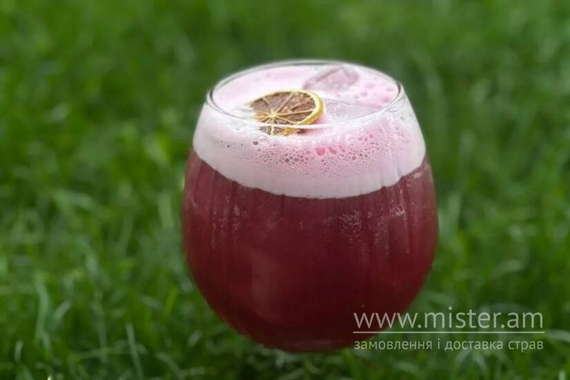Джин, лимоний фреш, сироп смородини, сік ананасовий.