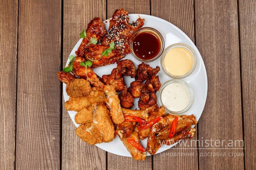 Крильця BBQ, крильця шрірача, крильця кріспі, крильця аперо, крильця sweet chili соус чеддер, соус бургерний, соус BBQ.