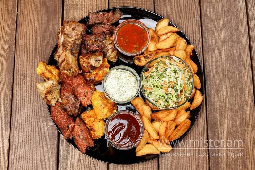 Кілограм м`яса з салатом із капусти та картоплею по-селянськи, три види соусів.